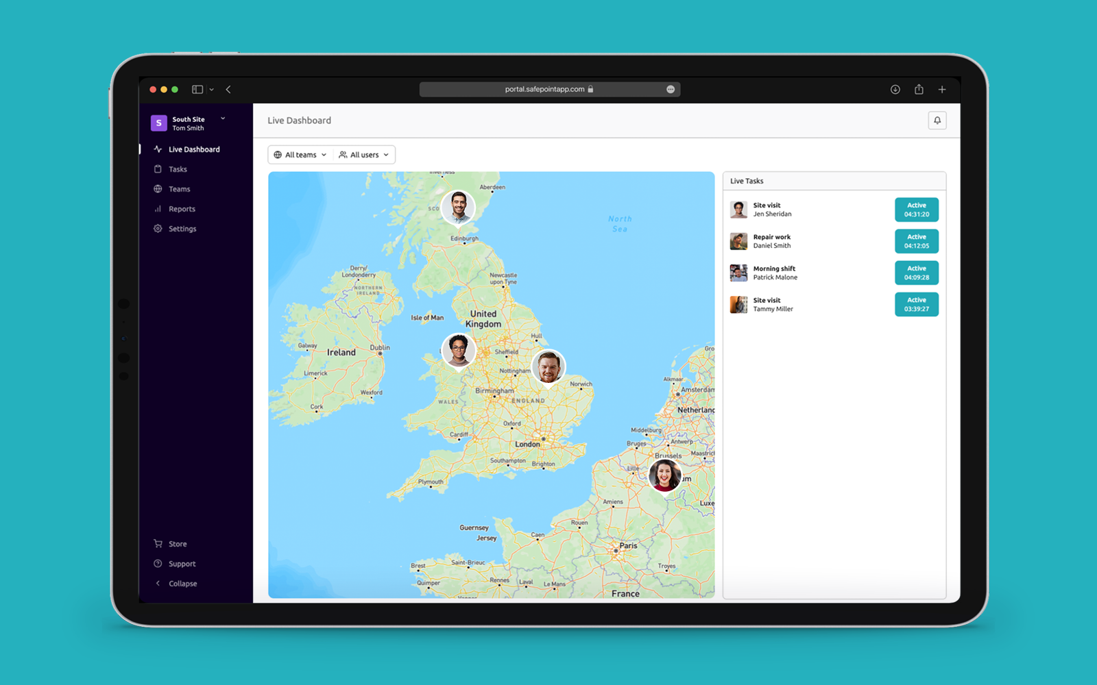 With Safepoint, you can see all active and historical lone working “tasks” and “alerts” via the team management Portal. Accessed via the Safepoint app or any online browser, the Safepoint Portal makes it easy to see who’s working on what job, where they are, and when they’ll be done.